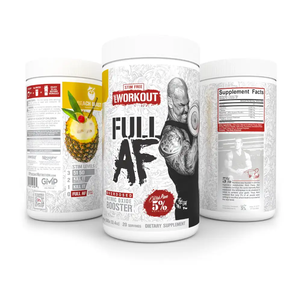 5% Nutrition Full AF is a Nitric Oxide Boosting Pump product that contains the most effective blood vessel dilating ingredients on the market dosed to extreme levels. Full AF will give you muscle expanding deep pumps that you will never forget.