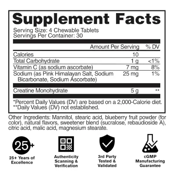 SUGGESTED USE: As a dietary supplement fully chew 1 serving (4 chewable tablets). Consume 1 to 2 times daily depending on your creatine needs. For best results, chew thoroughly before swallowing. Maintain an adequate state of hydration during use. Read the entire label before use and follow directions provided.