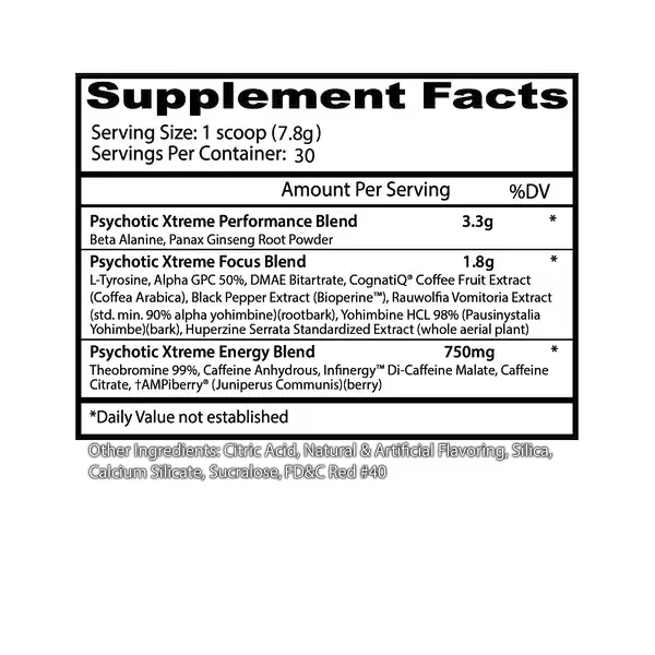 Insane Labz Psychotic Xtreme is a high-stimulant pre-workout designed for experienced users seeking intense energy, heightened focus, and sustained workout performance. Built as an evolution of the original Psychotic formula, this advanced blend combines multiple caffeine sources, nootropic ingredients, and performance-support compounds to help power demanding training sessions.
