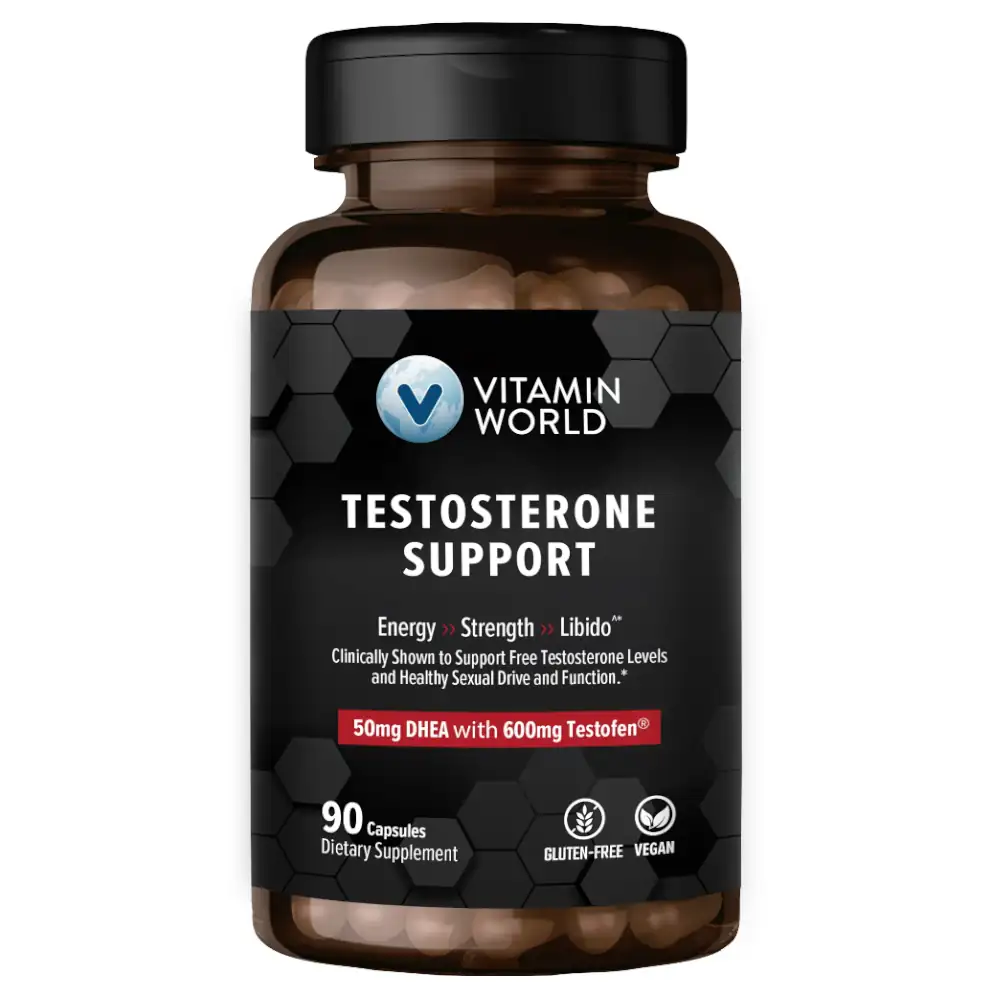 Vitamin World Testosterone Support is a comprehensive men’s vitality formula crafted to help maintain healthy testosterone levels, boost energy, and support overall performance.* Powered by clinically studied Testofen® Fenugreek Extract, micronized DHEA, and a targeted Vitality Complex, this supplement is designed for men seeking natural support for strength, stamina, and hormone balance.